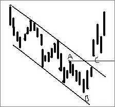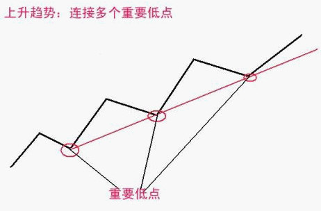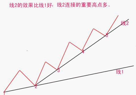 2)找出明显得两个地点(谷底),连成一条向上倾斜的直线,如果该直线不能包括某一段趋势段中的所有价位,那么有必要再去寻找地点来尝试,直到包含了某一段趋势段的所有价位.