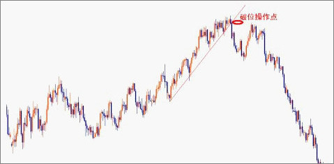 这个入市策略则较为冒险, 如果我们观察到, 价格在上升的趋势中, 价格跌穿了趋势线 (条件一), 而这个时候, 价格明显下跌, 但又没有出现跌破前低 (条件三) , 之后反而保持向上, 价格在接近新高的时候, 我们可以卖出, 并在前最高点之上设置一个安全回补纠错的策略。