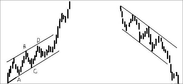 在上涨走势中,利用谷底决定上升趋势(支撑线),再取并行线切过股价波动的上缘(压力线),这两条线合称 上升通道 。