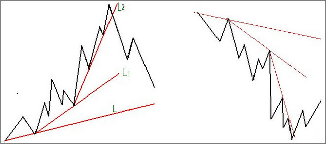 1)不同的趋势线往往在图表上表现为不同的倾斜角度,而不同的倾斜角度决定了这些趋势线具有不同的意义.就重要程度而言,市场普遍接受的一个评价标准是:45度倾斜角度的趋势线最有价值.这种角度的趋势线反映出市场随着时间运动的速率,正好处于价格和时间的完善平衡之中.