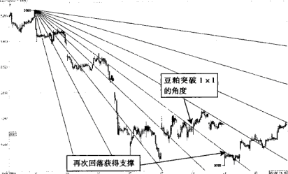 如图所示,豆粕1301合约的空头趋势当中,在江恩角度线的压制下,期货价格持续震荡走弱。其中,1 1的江恩角度线对趋势的影响是最大的。没有顺利突破1 1的江恩角度线之前,空头趋势还是会持续的。实战当中,把握住期货价格在1 1的角度线以下持续回落的大趋势,做空获利其实并不困难。豆粕1301 突破1 1角度线后的走势如图所示。
