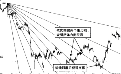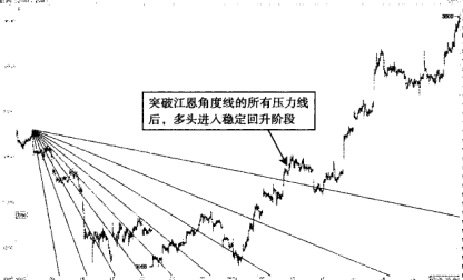 角度线是江恩理论的核心之一,对于江恩角度线一经确认,后期的操作就可以按照角度线提示的支撑或者压力来操作期货合约。上升趋势当中的江恩角度线,可以作为期货价格回升的支撑线来看待。下跌趋势中的角度线,可看作期货价格下跌过程中的阻力线。当然,江恩角度线的45 线周围存在着支撑线和压力线。每一条江恩角度线被有效突破后,都有一个确认的过程。