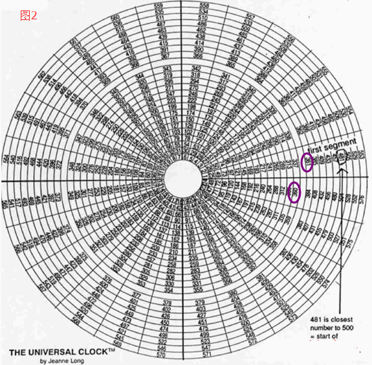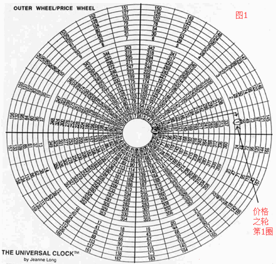 从图2中,我们可以清晰的看到,360是时间之轮的最后一个数字,361紧随其后。价格数字和时间数字本是统一的。当价格数字在360以内时,我们很容易看明白,时间之轮上的数字从来不会超过360 ,而价格之轮的数字却可以无穷大。这要求我们在排列价格数字时要多加注意,也就是这个原因,361只能排列在外轮的第一列,362或者364就不能排在第一列。其他能排在第一列的数字还有:385,409,433,457,481等,这些数字在轮子上连续排放时会落在数字1的这一列上。在此必须要强调,不管是制作内轮还是外轮,如果一个数字放置错误的话,之后就都会错。价格和时间就会直接扭曲,所以,只有数字排列顺序正确时,价格和时间之轮才能正常运转。