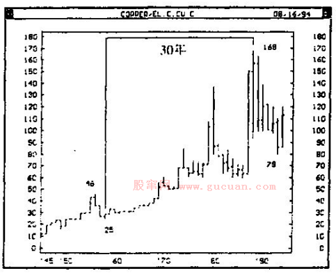 以30年作为循环周期的中心,除了天文学上的理由外,更重要的是许多商品期货的价格也确实按照30年周期运行。例如,江恩发现棉花期货即遵循这一规律。棉花期货在1864年创下历史最高价,30年后的1894年则达到价格最低点,又过了30年之后即1923 1924年间,棉花期货又攀上另一个高点。另一个例子是黄铜现货价格,1958年美国黄铜现货价格下跌至每磅25美分的谷底。在此30年之后的1988年黄铜大幅飙升至每磅168美分,形成价格峰顶。如若进一步观察,还可以发现真正的价格上升是从15年之后的1973年和20年之后的1978年开始的,所以黄铜价格30年周期中可再细分出15年周期和20年周期。如下图