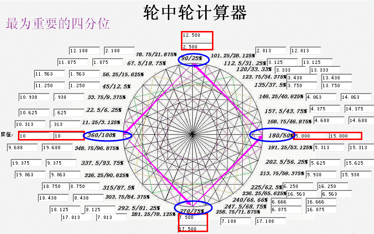 ① 外圈表示价格在上涨一倍的过程中重要的阻力位置,它是以江恩八分、三分为基础的,需要顺时针观察;