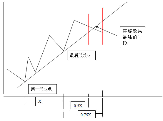 3、趋势线的有效期 :设趋势线第一形成点和最后形成点之间的时间差为X ,以趋势线最后形成点往后计时,在小于X的时间内有效,且以0.5X 0.75X为突破效果最强的时段。