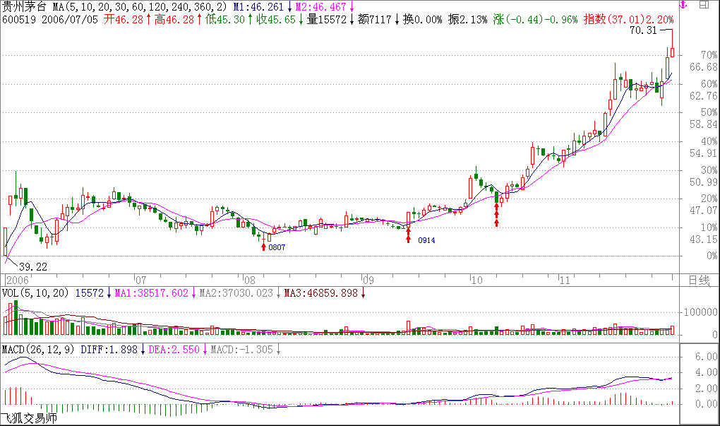 明白了这一点,任何不在这两个买点买入的行为都是不可以原谅的,因为这是原则的错误,而不是高低的区别,如果你选择了这个买卖系统,就一定要按照这个原则了。买的方式明白了,卖就反过来就可以了,这是十分简单的。一吻而消魂,学会这消魂之吻,就能在动荡的市场中找到一个坚实的基础。当然,相应的均线的参数可以根本资金量等情况给予调节,资金量越大,参数也相应越大,这要自己去好好摸索了。这点,对于短线依然有效,只是把日线改为分钟线就可以了。而一旦买入,就一直持有等待第一个卖点,也就是女上位缠绕后出现背弛以及第二个卖点也就是变成男上位的第一个缠绕高点把东西卖了,这样就完成一个完整的操作。