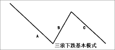 事物总是处在对立统一的矛盾体中,在波浪理论中驱动浪和调整浪就是一对矛盾体。驱动浪将股价推向高位,调整浪则将股价打向低位。调整浪的实质是对股票的价值修复,对空方力量的释放,是市场的一种等待状态。调整浪是波浪理论中极为复杂的部分,常以A、B、C三浪下跌的形态出现。图中所示为三浪下跌的基本模式。