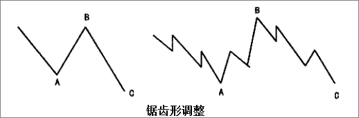 锯齿形调整是以简单的三浪下跌展开的,浪B的高点明显高于浪A的底部,而且很有可能达到浪A的顶部。锯齿形的调整显示的是市场中弱势的调整,是牛市行情中的展现。图中所示锯齿形调整浪的模式。