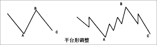 平台形调整是一种比较常见的调整方式,浪B通常会在浪A的顶部附近停止或者超过浪A的顶部,浪C则会在浪A的底部附近便结束,如图所示。