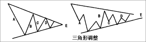 图中左边的形态是简单的三角形调整,右边的形态是三角形调整在中国股市中的常见表现。这种常见调整包含5个重迭的3-3-3-3-3子浪,标示为A-B-C-D-E。无论是简单形态还是复杂形态,三角形调整就是市场即将出现反转的信号。