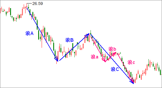 我们可以印证下跌浪的实战演变。浪A是股价在形成高位后的下跌走势,整个走势比较凶猛;浪B是下跌途中的反弹,这是减仓出逃的最后机会;浪C是最后的下跌,在图中的浪C又由3个次一级的波浪组合而成。