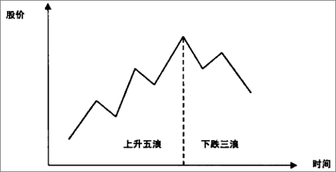 图中左半部分就是上升五浪,在此阶段当中,股价以五浪形式向上运动,由此也可以把这一阶段称为驱动五浪;右半部份是下跌三浪,是股价的调整阶段,股价向下运动。