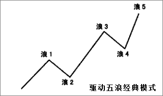 波浪的发展方式有两种:驱动方式和调整方式。驱动浪是以驱动方式在发展,其中的五浪又分为股价向上运动的三浪(浪1、浪3、浪5)和股价向下调整蓄势的两浪(浪2、浪4).如图所示为经典的五浪模式。