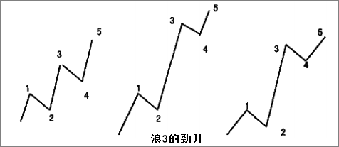 图为浪3迅速上攻的3种常见形态,其中第二种形态的浪3突破性最强,涨幅也就远远地超过了浪1的上涨。