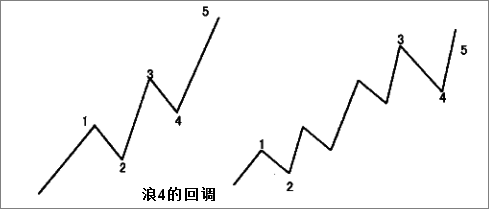 图中展示了两种形态,左边的是一种比较常见的浪4回调位置;右边是在浪3长时间上涨的情况下,浪4回调的幅度以及位置。
