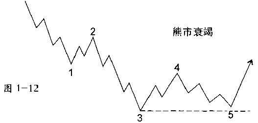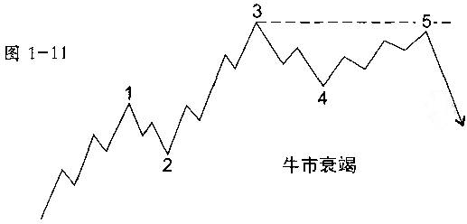 艾略特用 失败 一词来描述第五浪末能运动得超过第三浪终点的情况。但我们喜欢更明确的名称: 衰竭(Truncation) 或 衰竭的第五浪 。衰竭通常可以通过注意假设的第五浪必须包含五个子浪来检验,如图1 11和1 12所示。衰竭通常在超强势的第二浪之后出现。
