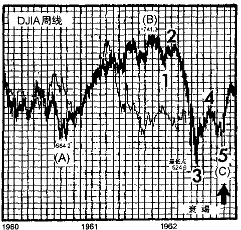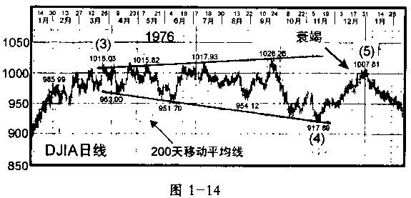 1932年以来,美国股市提供了两例主要浪级的衰竭第五浪的例子。第一例出现在古巴危机(CubanCrisis)时的1962年10月(见图1 13)。它紧随着作为浪3的大跌之后。第二例出现在1976年末(见图1 14)。它跟在1975年10月至1976年3月出现的快速上扬的浪(3)之后。
