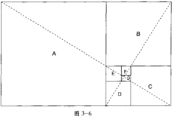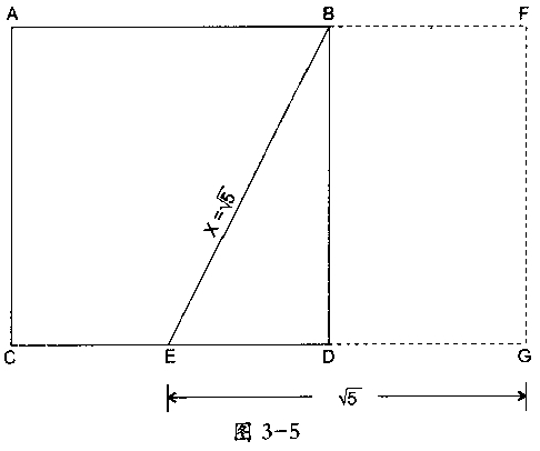 三角形EDB是一个直角三角形。大约在公元前550年,毕达哥拉斯曾证明,直角三角形的斜边(X)的平方等于二直角边平方的和。因此,在本例中,X2=22+12,或X2=5。所以线段EB的长度必是5的平方根。构造黄金矩形的下一步是延长线段CD至点G,使EG的长度等于5个单位长度的平方根,或2.236个单位长度,如图3 5所示。画完时,矩形相邻两条边呈黄金比,所以矩形AFGC和矩形BFGD都是黄金矩形。证明过程如下: