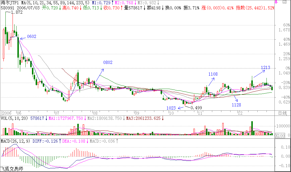 纯粹的两条均线的K线图,就足以应付最复杂的市场走势了。当然,如果没有这样的看图能力,可以参照一下技术指标,例如MACD等,关于各技术指标的应用,以后会陆续说到。