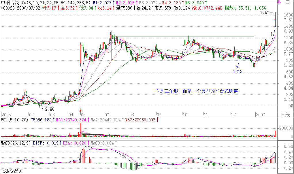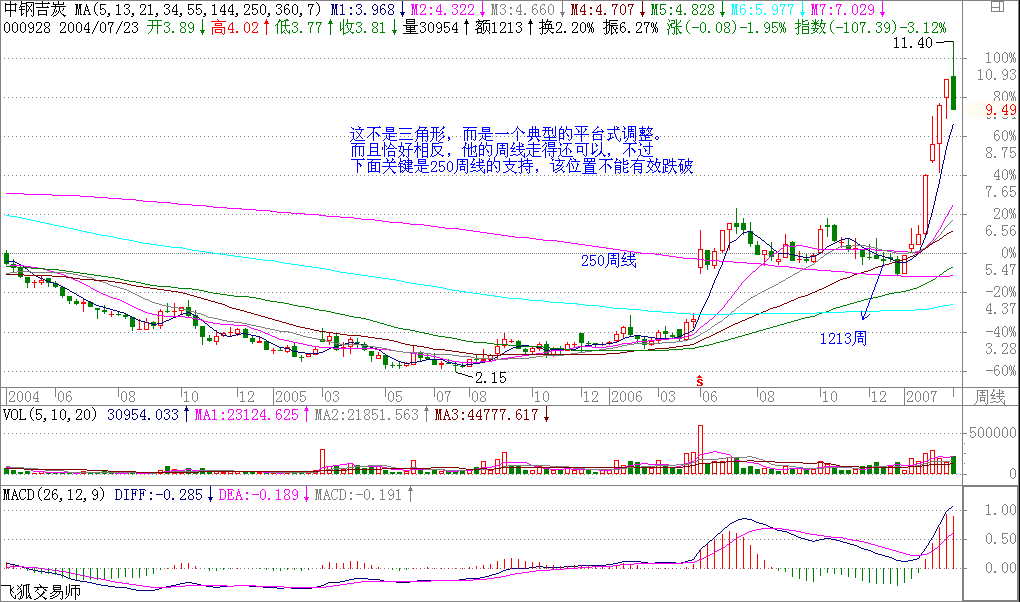 这不是三角形,而是一个典型的平台式调整。而且恰好相反,他的周线走得还可以,不过下面关键是250周线的支持,该位置不能有效跌破。