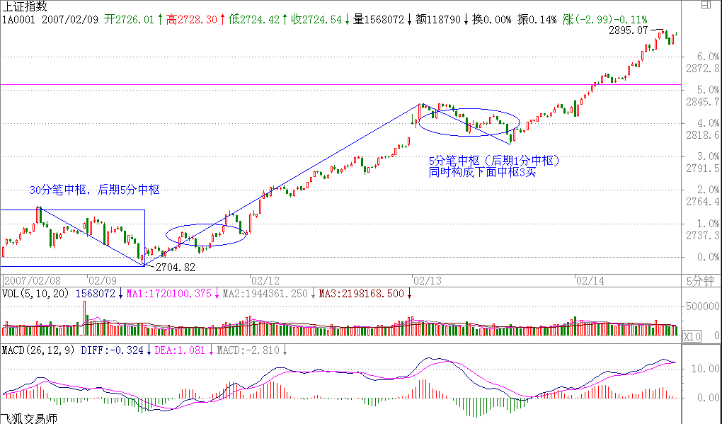大盘没什么可说的,就是昨天说的在这里形成一个中枢,今天下午拉起一波,构成5分钟图上的盘整背驰,这个5分钟的中枢就像30分钟的中枢扩展。明天还要继续完成确认这个中枢,如果看不明白中枢的,就看2720点,有效站稳该点前,震荡依旧。一旦中枢确认,而又出现30分钟次级别以下的背驰后站稳2720,那么新1波上扬就出现,但2850上压力比较大(本人注:即1月份中枢的上沿)。今天是温柔的浙江人的忌日,本ID有一个令无数庄家闻风丧胆的坏毛病,就是一旦一只阻击的股票到1倍升幅以后,本ID一定找一个机会把手里的货出掉一半,然后本ID的成本就是负数了,后面,怎么玩本ID都肯定是赢家。不过777的题材还在,中线还是有很大空间的,只是本ID的负成本计划在999之后又一次胜利完成,当然要立字为据。