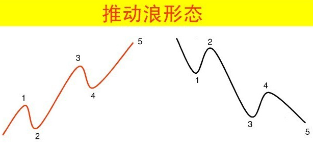 推动浪有五浪构成。第一浪通产只是由一小部分交易者参与的微弱的波动。一旦浪1结束,交易者们将在浪2卖出。浪2的卖出是十分凶恶,最后浪2在不创新低的情况下,市场开始转向启动下一浪波动。浪3波动的初始阶段是缓慢的,并且它将到达前一次波动的顶部(浪1的顶部)