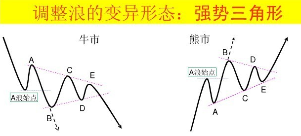 强势三角形,通常三角型态中每一个次级浪均是依次递减(增)的,但在某些时候,特别是收缩三角形中,B浪会突破A浪的始点,这样就形成了强势三角形型态。这种情况的出现,说明市道极为强劲。但这究竟是新一轮升势(虚线)还是B浪反弹?的确是一件头痛的事情。