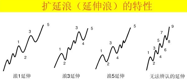 扩延浪也称延伸浪,是指浪的运动发生放大或延长的情况。当波浪发生延伸时,将会使得此一波浪序列形成大小相似的九浪,而如果延伸浪中再出现延伸,则我们会见到十三个大小相似的波浪。通过对扩延浪的分析可以预测其后调整浪回落的终点。