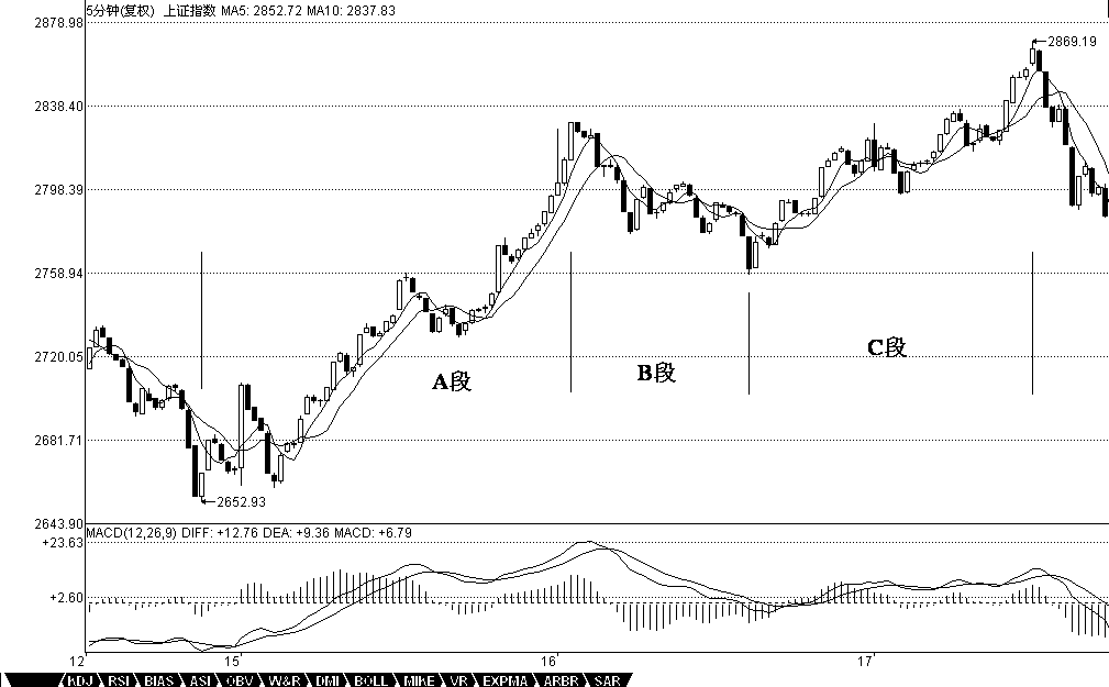 必须说明的是,由于MACD本身的局限性,要精确地判断背驰与盘整背驰,还是要从中枢本身出发,但利用MACD,对一般人理解和把握比较简单点,而这已经足够好了。光用MACD辅助判断,即使你对中枢不大清楚,只要能分清楚A、B、C三段,其准确率也应该在90%以上。而配合上中枢,那是100%绝对的,因为这可以用纯数学的推理逻辑地证明,具体的证明,以后会说到。