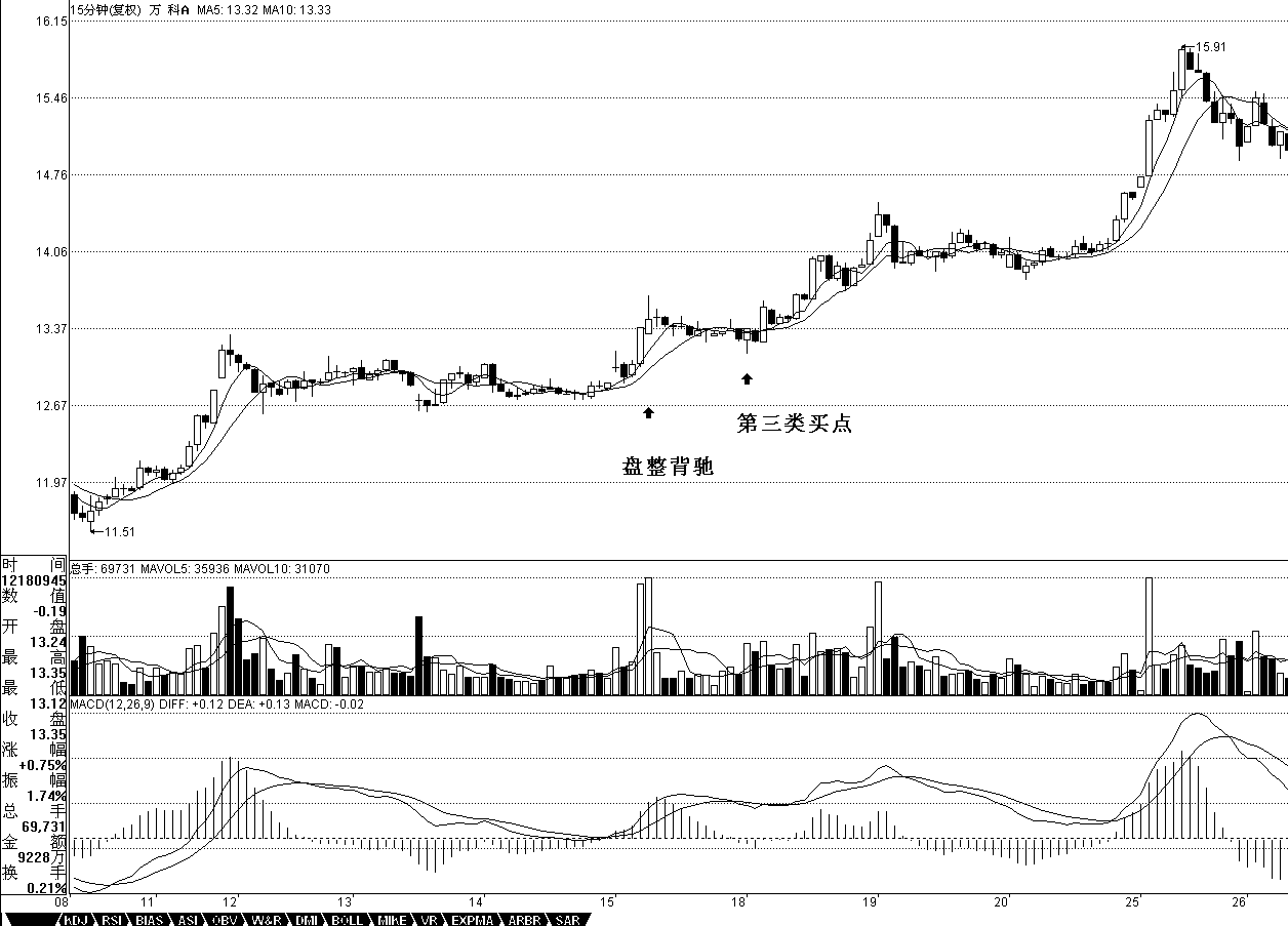 那么,有没有盘整背驰后回跌形成第三类买点的例子,其实这种例子太多了,第三类买点,有一种情况就是这样构成的。例如,000002万科的15分钟图,12月15日10点45分,构成一个盘整背驰,所以要出来,其后的次级别回跌并不重新回到前面的中枢里,就在18日9点45分构成了标准的第三类买点,这时候就该重新回补了。
