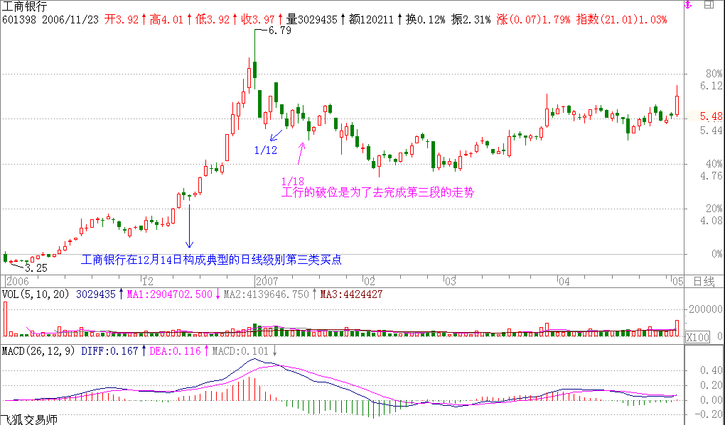 盘整中往上的情况为例子,往下的情况反之亦然。如果C段不破中枢,一旦出现MACD柱子的C段面积小于A段面积,其后必定有回跌。比较复杂的是如果C段上破中枢,但MACD柱子的面积小于A段的,这时候的原则是先出来,其后有两种情况,如果回跌不重新跌回,就在次级别的第一类买点回补,刚好这反而构成该级别的第三类买点,反之就继续该盘整。