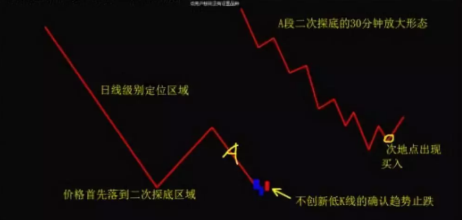 首先日线定位区域,30分钟去找买入的点。在日线没有出现符合条件的二次探底形态的时候不用看30分钟级别图,小级别要服从大级别趋势。日线级别到了二次探底的位置,日线级别出现底分型,底部结构,底部结构首先要有一根不创新低的K线让趋势暂时止跌,先止跌才有可能出现反转。日线级别到了位置且有一根不创新低的K线确认,然后30分钟级别找次低点,次低点出现就可以买入了。止损位设置在底部结构创新低的那天的K线的最低价。