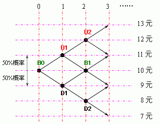 开仓后,价格有50%的概率从10元上涨到11元(到达U1点),也有50%的概率是下跌到9元(到达D1点)。假设在1个时间间隔之后价格是到达U1点,上涨到11元。到达U1点之后,价格同样是有50%的概率从11元上涨到12元(到达U2点),有50%的概率跌回10元(到达B1点)