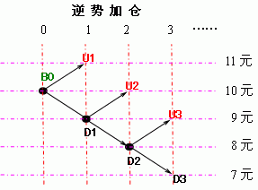 这500次中平均有250次会回到D2,虽然价格只是回到10元,但是由于在U1处加仓1手,所以总体上会亏损1元。