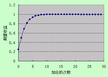 不过,在这个图里面,也很明显地,当加仓的次数达到第10次的时候,期望收益的增长已经极其接近于极限,再继续加仓下去,对期望收益的提升已经微乎其微。由于实际上受资金量的限制,不可能为了实施持续加仓的计划而把资金等分成100份、1000份,而顺势加仓的这个性质也说明其实这样做的意义也已经很小了。只要连续加仓多次(在这里是10次)以后,就基本上可以达到无限加仓的终极效果。