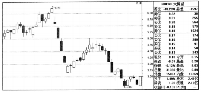 如图是大橡塑2007年5月30日当时的走势图,从图中我们看到自从 5 30 著名的 半夜鸡叫 之后,大橡塑就出现了连续五个跌停板。之后虽然有所反弹,但是反弹之后又是杀跌,从最高6.29元跌至最低3.08元,价格出现了腰斩。试想如果不能及时卖出也不能控制好仓位,虽然处于2007年轰轰烈烈的大牛市中, 5 30 这样的一次大调整就可能让你损失殆尽。