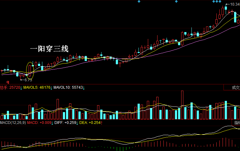 股价经过长期下跌以后,做空能量得到了有效释放,成交量的日益萎缩,表明场内浮动筹码已经不多,随着时间的推移,成交量由小到大,表明有一股资金正在悄悄吸纳,而股价波幅的日益收窄,表明庄家的收集已经进入尾声。如果有一天股价突然携量上攻,那一定是庄家大打出手了,快速跟进方显英雄本色。 一阳穿三线 是股价起涨的临界点,从这个点位切入,一般都会获得一段客观的利润。