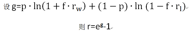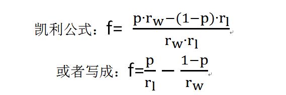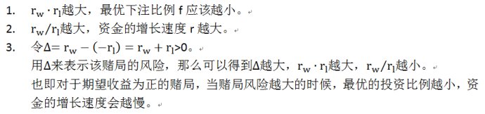 其中f为最优的下注比例。p为赢的概率。rw是赢时的净收益率,例如在赌局1中rw=1。rl是输时的净损失率,例如在赌局1中rl=1。注意此处rl 0。
