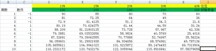 如图,我们分别将仓位设定为10%,15%,20%,30%,40%。他们对应的列数分别是D、E、F、G、H。