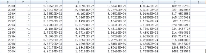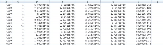 如上图,第一列表示局数。第二列为胜负,excel会按照60%的概率产生1,即60%的概率净收益率为1,40%的概率产生-1,即40%的概率净收益为-1。第三列为每局结束时赌客所有的资金。这个实验每次下注仓位是99%,初始本金是100,分别用黄色和绿色标出。