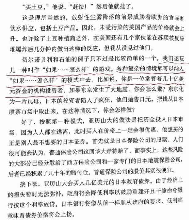 5.1 提前做预判:这个需要投资人在平时就采用发散性思维看待经济社会里的各种现象,日常就准备好,到了某个特殊事件真的发生了,自己只需要将平时的 应对策略 搬出来用就好。另外,投资人可以在平时就做上面《说谎者的扑克牌》中 if....and then... 的头脑训练。