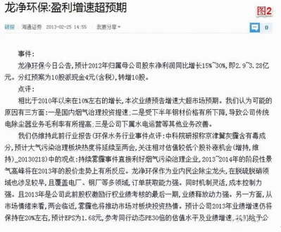 后来,媒体开始报道PM2.5的严峻性,那个时候是2013年的1月左右,马上就要召开全国的两会了。当年两会的核心就是 关注民生 。所以,有一个事件驱动型投资机会思维链条建立了:PM2.5严重 国家关注民生 两会马上召开---- 环保股估计会爆发---- 定性分析结束,现在进入定量分析阶段---- 如何选择环保股里的龙头---- 通过分析与筛选确定一个环保股portfolio:国电清新,龙净环保,燃控科技,九龙电力,永清环保,龙源技术。---- 定量分析的第二阶段,选择龙头股:600388龙净环保---- 等量定量分析的第三阶段: portfolio里的操作顺序逻辑:先做龙头,600388龙净环保,等这个龙头起来后,估计portfolio里面的相关环保个股会因为龙头股的走强而形成板块内的个股依次爆发,那个时候再见机行事。当时我在2013-02-22周五买入龙净环保,很幸运的是,在周六龙净环保出公告,大利好(见图2)。