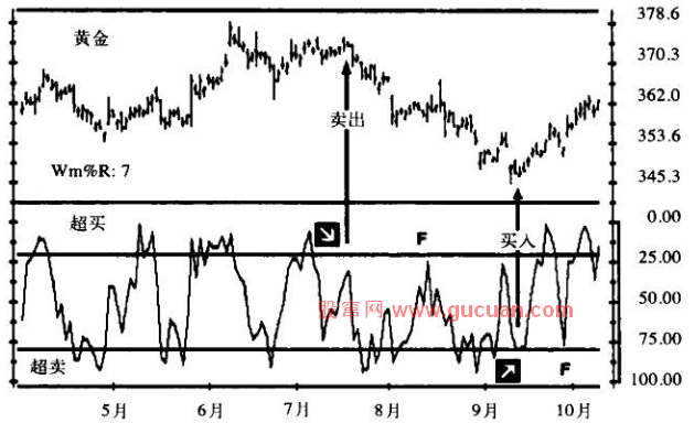 6.当Wm%R下滑到超卖基准线下方,行情可能超跌而形成底部,代表买进讯号。 在横向走势中,这类的超买与超卖讯号通常不错,可是,当市场呈现明显的趋 势,这些讯号通常都有过早发生的倾向,让使用者陷入险境。在强劲的涨势中,Wm%R 可能停留在超买区数个星期;超买是强势的表现,不代表放空的机会。同理,在强劲的跌势中,Wm%R可能停留在超卖区数个星期,这是弱势的表现,不代表买进的机 会。