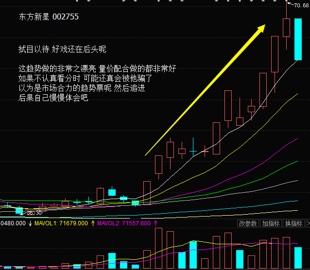 所以这种票大多数也都是资金接力上去的结果,而几乎没有任何一波资金可以从头吃到尾。这种票有个很大的优点,涨起来的时候很漂亮,而且还不容易套人,因为它基本不会直接形成尖顶,会在高位震荡,逻辑就是总有人会不甘心的前仆后继。