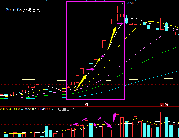 2、一波上涨之后,强势一点的调整是严格沿着五日线的,比如后面的这个例子廊坊发展[1.86% 资金 研报],弱一点的调整会稍稍击穿五日线,比如前面的例子科恒股份[4.32% 资金 研报]。