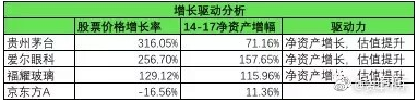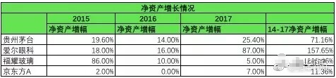 无论是贵州茅台,爱尔眼科还是福耀玻璃,14-17年间,净资产都有较大的增长,增长率较高的是爱尔眼科,最低的是贵州茅台;