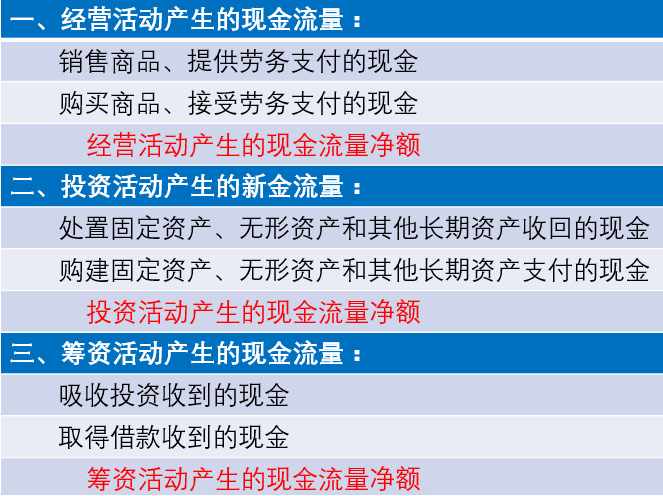 现金的流入和流出,是由经营活动、投资活动、筹资活动产生的。