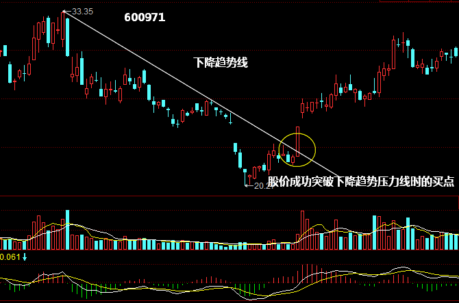 个股经过长时间的大幅下跌,在成交量放大的配合下成功突破长期下降趋势线的束缚,很快出现了大幅上涨的走势,给投资者提供了一次良好的买入机会,如图9-2所示。