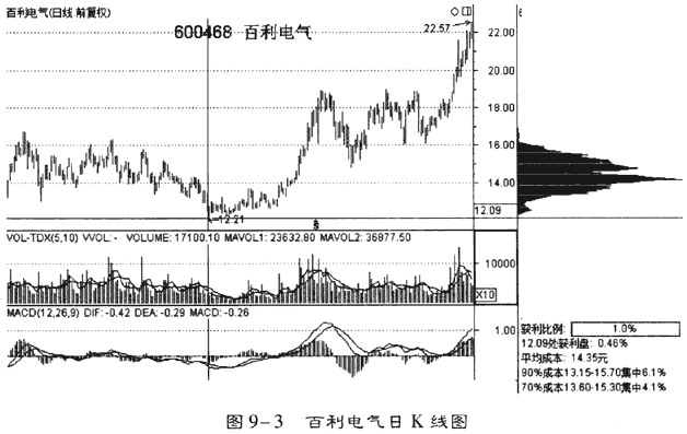 例如,百利电气在14~17元/股之间形成密集区,有大量筹码在这一区间被套牢,使该股一直运行于套牢筹码之下,此后股价强劲突破了该区域且创出了新高,显示了主力有志在高位的打算和意图。因此,前期高位就有可能成为新一轮行情的起点,所以投资者可以追涨操作,如图9-3所示。